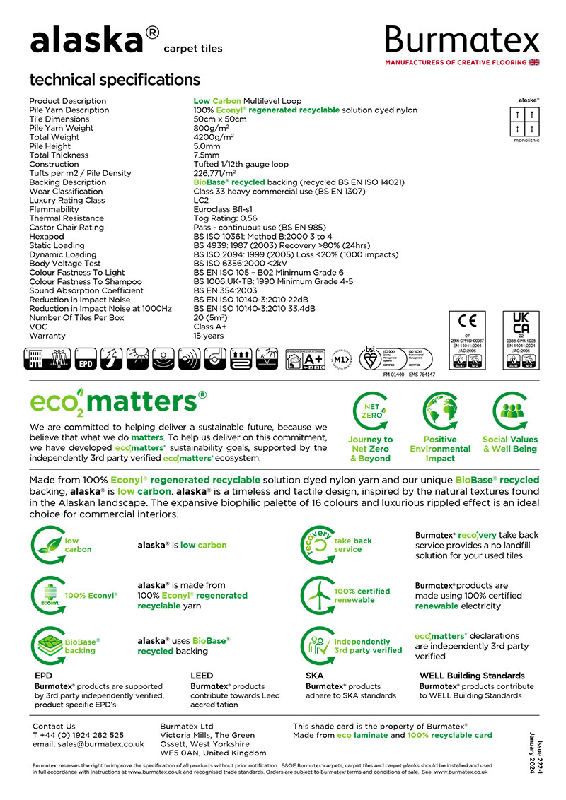 Der Preis gilt pro m². Verkauf nur in ganzen Verpackungseinheiten von 5 m². Die vollständige Farbpalette der Kollektion finden Sie unter dem Link Burmatex Alaska.