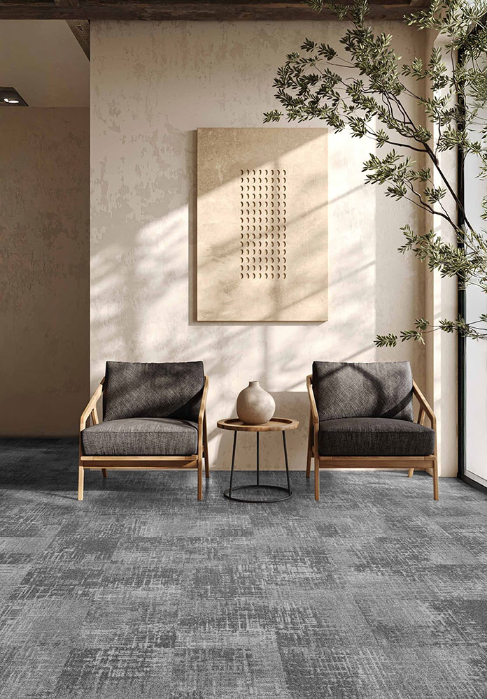 Die fein abgestimmte Farbpalette umfasst dezente Natur- und Grautöne mit subtilen Kontrasten. Dieses zurückhaltende, aber lebendige Design eignet sich ideal für Open-Space-Büros, Besprechungsräume, Hotels oder öffentliche Gebäude. Gleichzeitig hilft die strukturierte Oberfläche dabei, Gebrauchsspuren im stark frequentierten Objektbereich optisch zu minimieren.