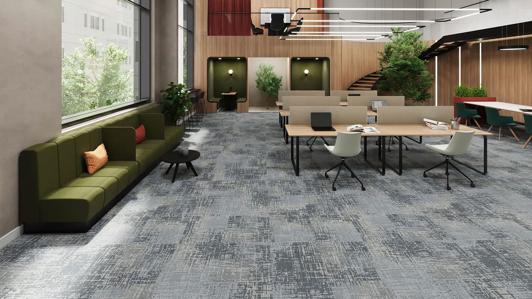 Ideal für Büros, Kommunikationszonen und repräsentative Gewerbeflächen, überzeugt Surface Trace durch hohe Strapazierfähigkeit, angenehme Raumakustik und eine ruhige, professionelle Wirkung.