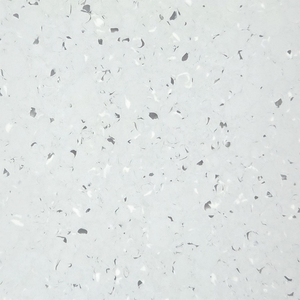 Die Oberfläche zeichnet sich durch eine gleichmäßige Struktur mit eingestreuten, unregelmäßigen weißen und grauen Partikeln aus, die dem Boden ein modernes, leicht terrazzoähnliches Aussehen verleihen. Dieses dezente Design lässt sich hervorragend in funktionale Innenräume integrieren, ohne auf eine professionelle Optik zu verzichten.