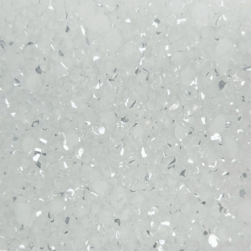 Die Oberfläche zeichnet sich durch eine gleichmäßige Struktur mit eingestreuten, unregelmäßigen weißen und grauen Partikeln aus, die dem Boden ein modernes, leicht terrazzoähnliches Aussehen verleihen. Dieses dezente Design lässt sich hervorragend in funktionale Innenräume integrieren, ohne auf eine professionelle Optik zu verzichten.