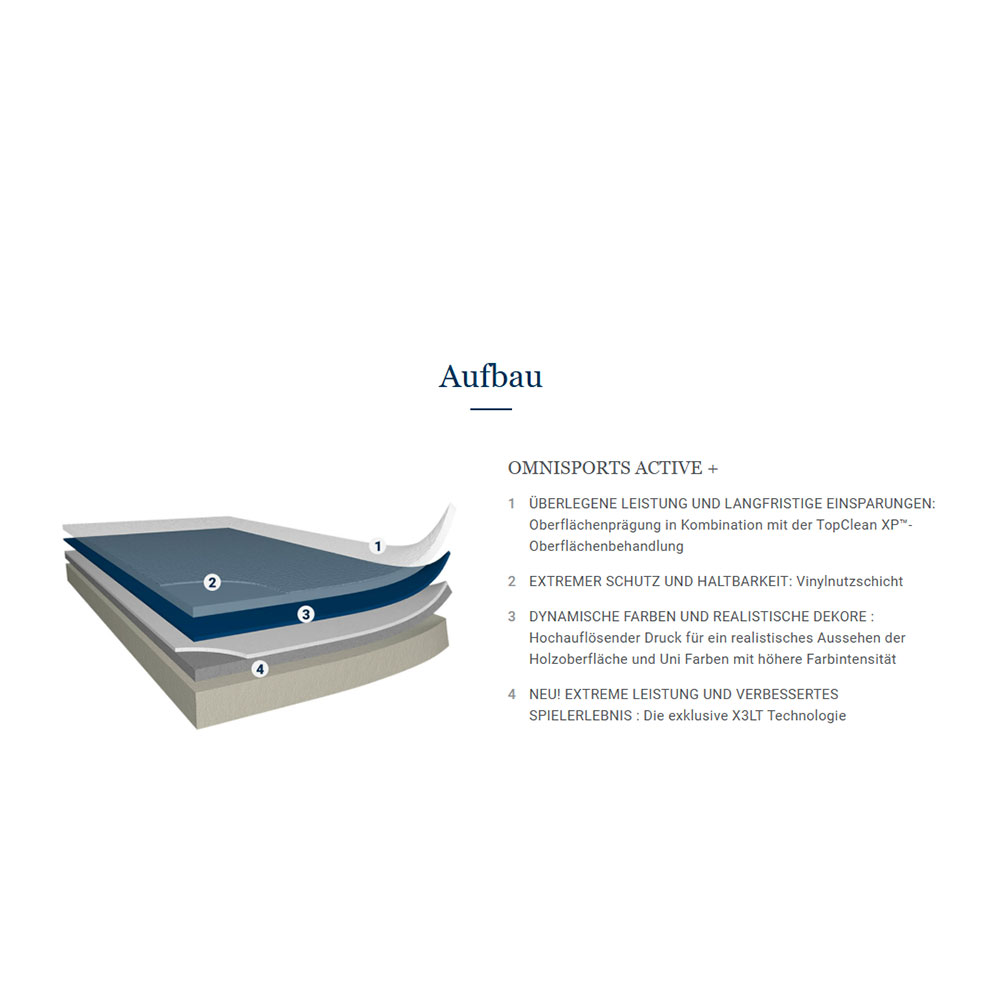 Indoor Sportböden Tarkett Omnisport Active+ bieten höchste Performance, Komfort und Sicherheit für Sporthallen, Schulen, Fitness- und Mehrzweckräume. Mit einer Gesamtstärke von 8,1 mm und einer 0,70 mm starken Nutzschicht überzeugt der Boden durch hervorragende Stoßdämpfung, hohe Widerstandsfähigkeit und ein optimales Spielverhalten. Die pflegeleichte TopClean XP™-Beschichtung sorgt für einfache Reinigung und langanhaltende Ästhetik. Erhältlich in zehn modernen Farbvarianten, ideal für Basketball, Volleyball, Handball, Gymnastik, Badminton, Tischtennis und Fitnessbereiche.